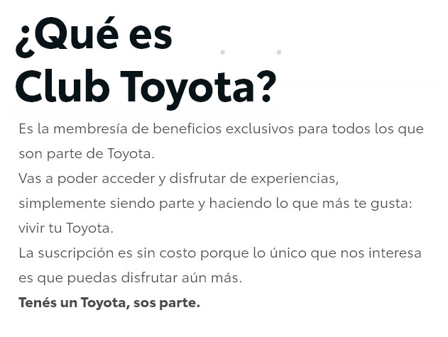 Porque siempre confiaste en nuestra marca, porque queremos acercarnos más a vos y porque queremos que disfrutes aún más de tu Toyota. Por eso, te acercamos a un mundo de experiencias únicas. Es nuestra forma de decirte gracias por formar parte!